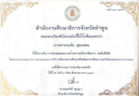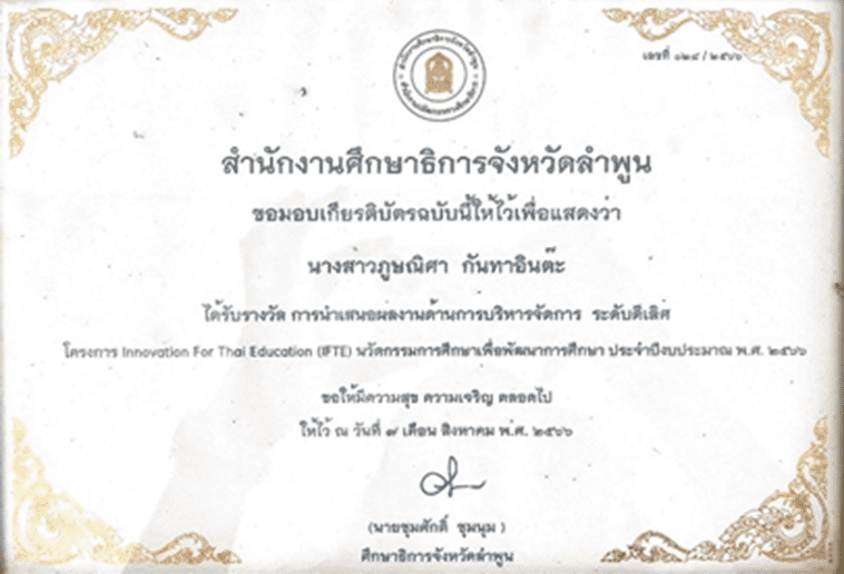 ได้รับรางวัลการนำเสนอผลงานด้านการบริหารจัดการ ระดับดีเลิศ โครงการ Innovation For Thai Education (IFTE) นวัตกรรมการศึกษา เพื่อพัฒนาการศึกษา ประจำปีงบประมาณ 2566 |